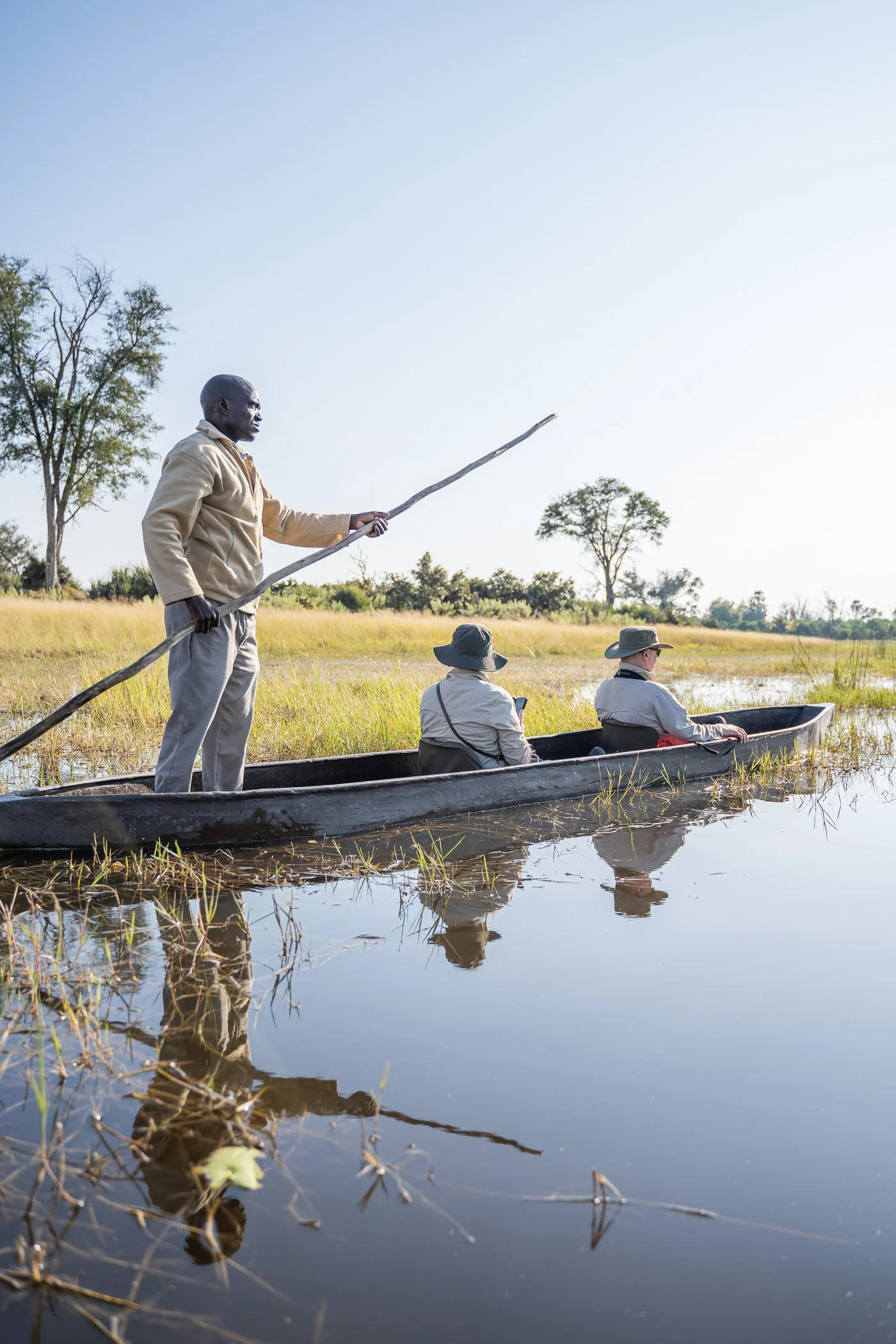 Mokoro sur les canaux à l’aube, safari à pied au cœur de la brousse, 4×4 dans les plaines inondées ou survol en hélicoptère pour embrasser l’immensité du delta : chaque sortie est une expérience à part entière.