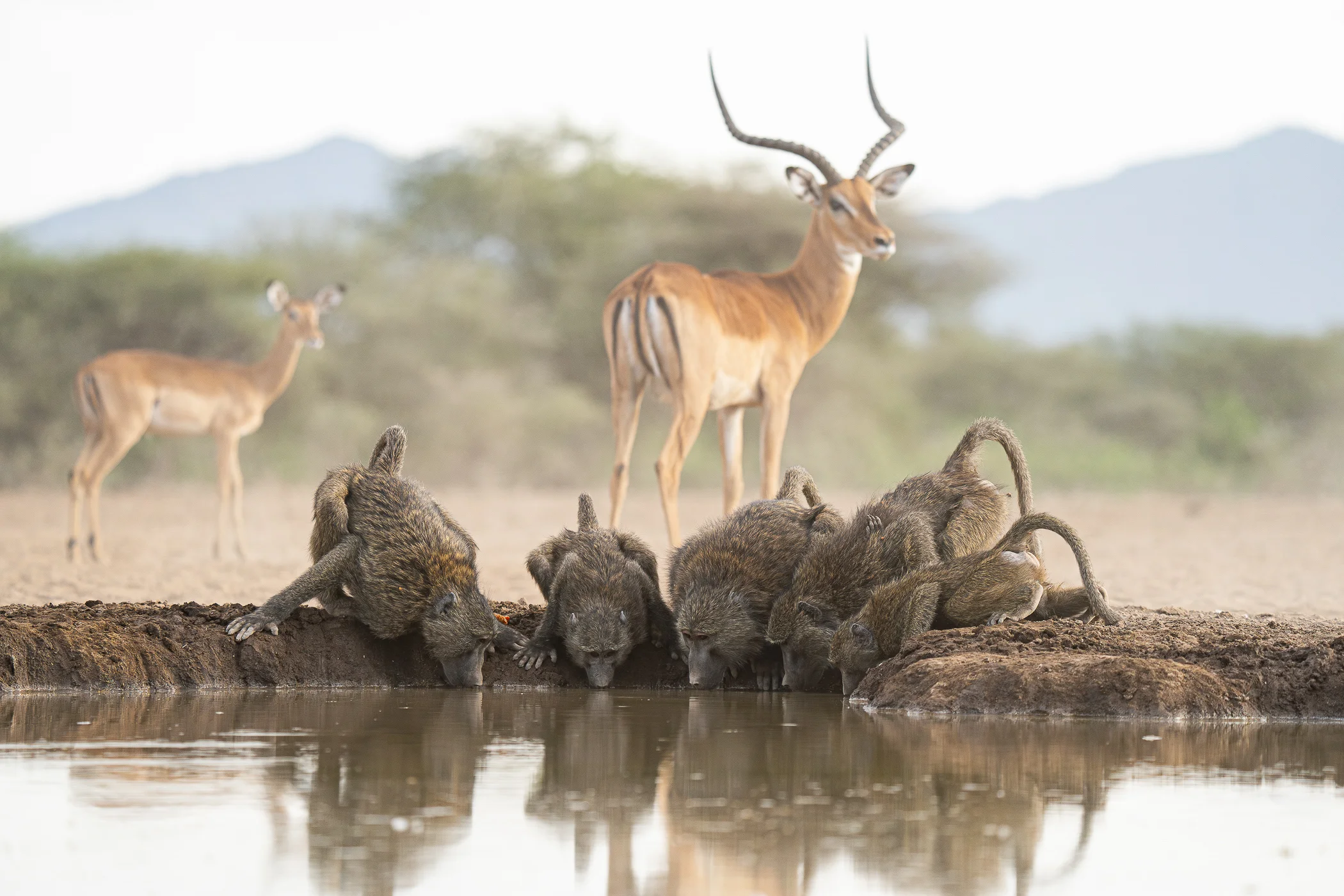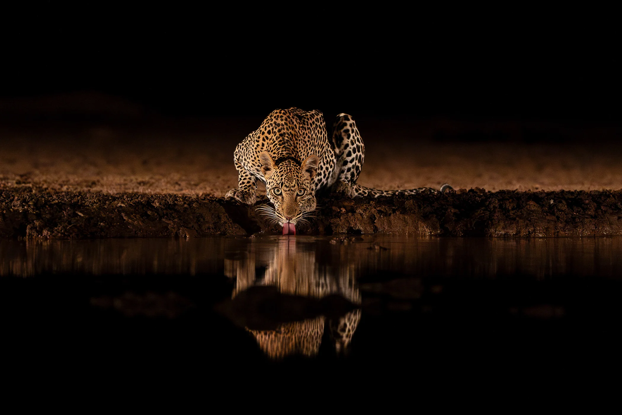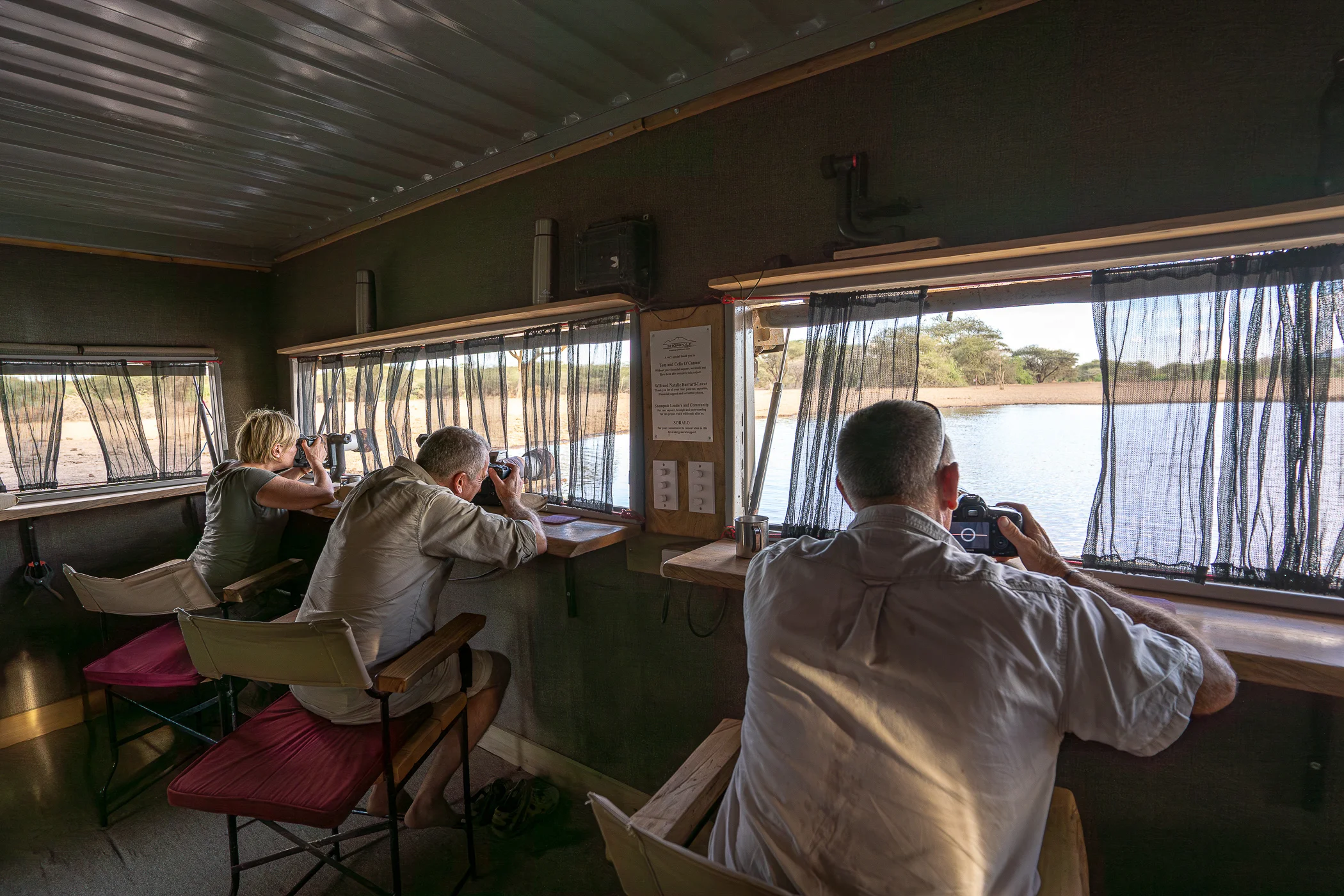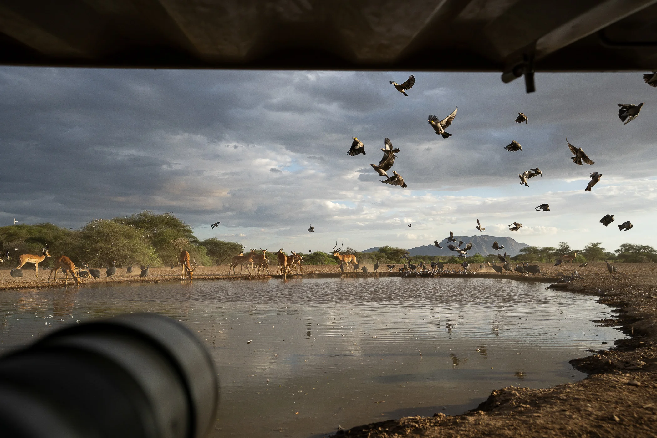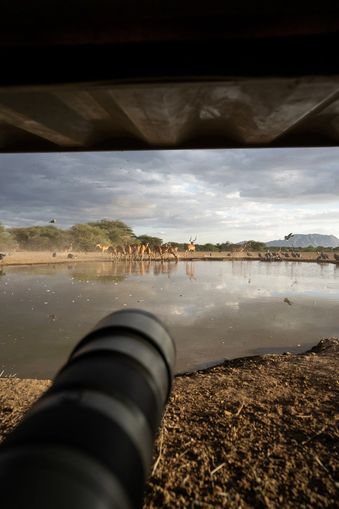 Ce qui rend cet endroit vraiment unique, ce sont les affûts photographiques positionnés au ras de l’eau, à proximité de points d’eau fréquentés jour et nuit. Pendant la saison sèche, les animaux s’y concentrent pour s’abreuver : hyènes rayées, léopards, caracals, porcs-épics, mais aussi girafes, zèbres, gnous et impalas. La nuit, les animaux les plus furtifs prennent le relais : genettes, civettes, chacals à chabraque et mangoustes à queue blanche. Ces caches entièrement équipées, avec toilettes et lits pour y passer la nuit, offrent des observations intimes et des angles de prise de vue impossibles à obtenir depuis un véhicule.